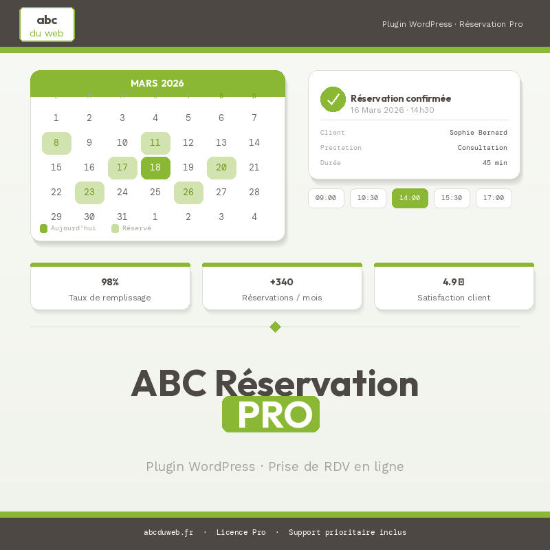 ABC Réservation Pro est le plugin WordPress complet conçu spécifiquement pour les propriétaires de gîtes, chambres d'hôtes et locations saisonnières. Intégrez un système de réservation en ligne professionnel à votre site en quelques clics, sans abonnement à une plateforme tierce.